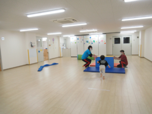 2024.05.27 ☆きょうのKIDS☆ おへやで運動 きょうは雨がふりそうなので、おへやのなかで遊びます。 こうするんだよ、お手本どおりにできるかな。 いっぽんばし、ばっちりできました、やった。 つぎは何しようかな。 かべごえにチャレンジです、いくぞー。