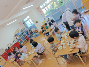 給食の先生から「パンには切り込みが入っています」「パンは2つあるけど、ハンバーグは1つ。どうやって食べてもいいよ!」とヒントをもらいました。