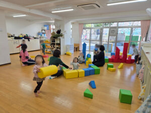 2025.01.17 ★こじか/こどもたちのようす★, お知らせ 🐻保育の様子 こぐまぐみでは、大型積木で遊びました。 横に並べてみたり、高く積み上げてタワーを作ってみたり、てっぺんに三角積木を乗せて家を作ってみたりと、思い思いに形を作って楽しんでいました!