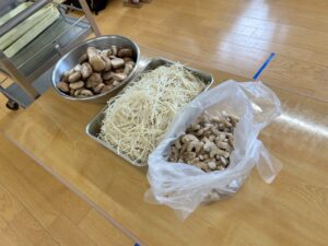 裂いたきのこは、明日の給食のきのこ混ぜご飯として出ます。