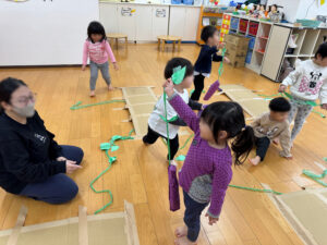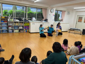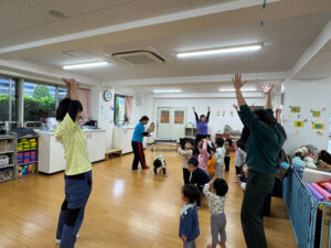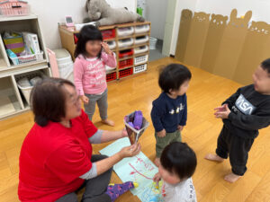 みんなで、「やきいもグーチーパー」や「大きな栗の木の下で」の手遊びをしました。