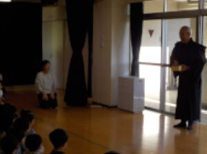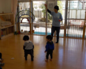 園長先生がホールで、