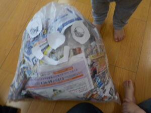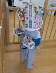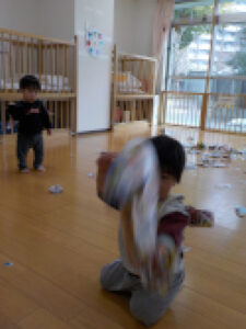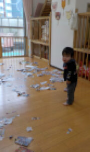 2026.02.13 ★こじか/こどもたちのようす★, お知らせ 🐿️広告紙遊び 広告紙でリボンを作ったり、帽子を作ったり 雪にして遊んだり 最後は雪だるまのように集めてみました! 広告紙遊びは楽しいね♪